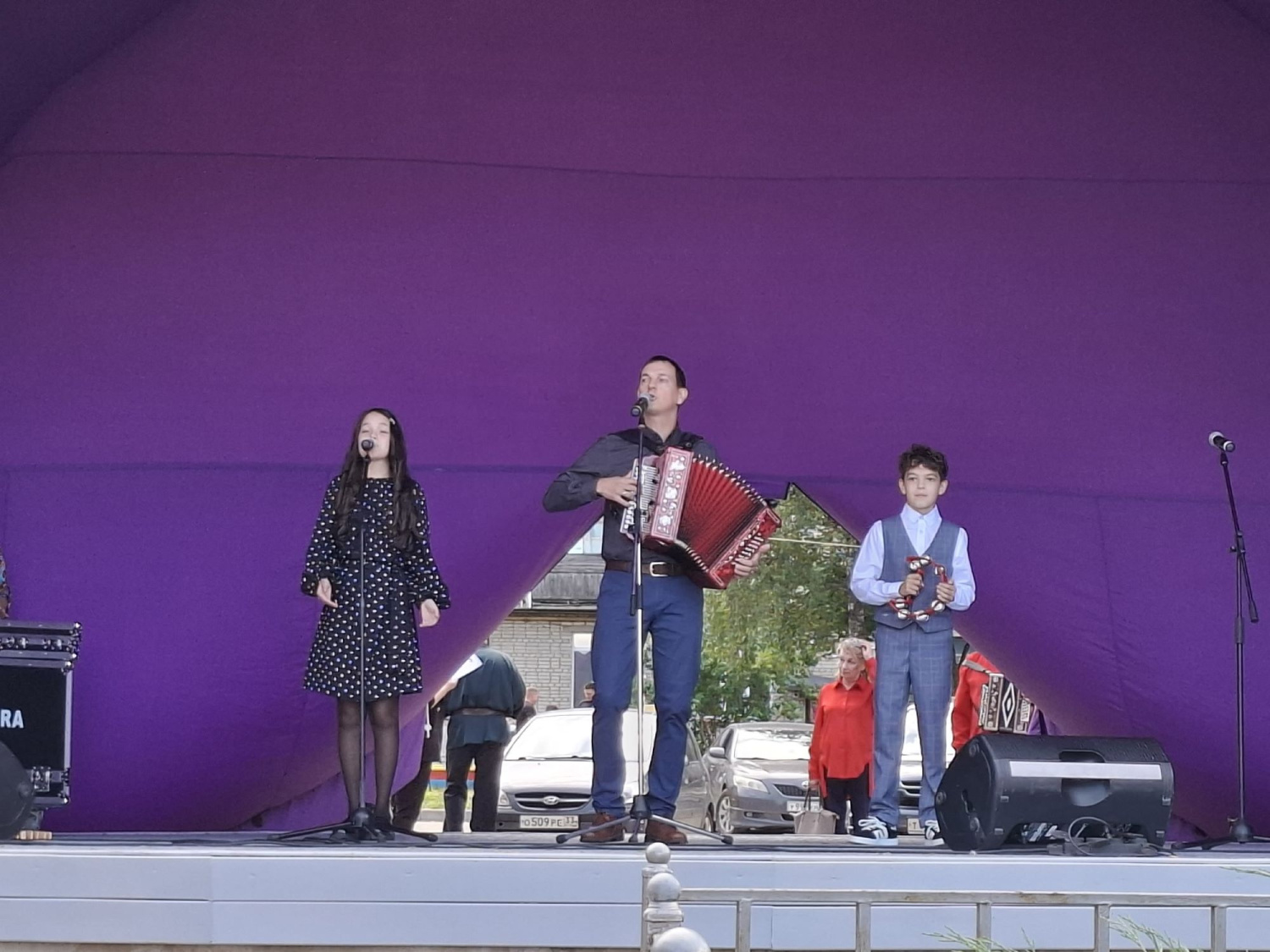 Первыми на сцену были приглашены супружеская пара Марина и Евгений Саломакиных из д. Головино с песней «Спустилась ночь», затем к Марине присоединилась дочь Мария и зять Сергей. Дружными одобрительными аплодисментами приветствовали собравшиеся сообщение ведущей, что эту молодую пару Зининых в коляске слушает их уже пятый двухмесячный ребёночек.