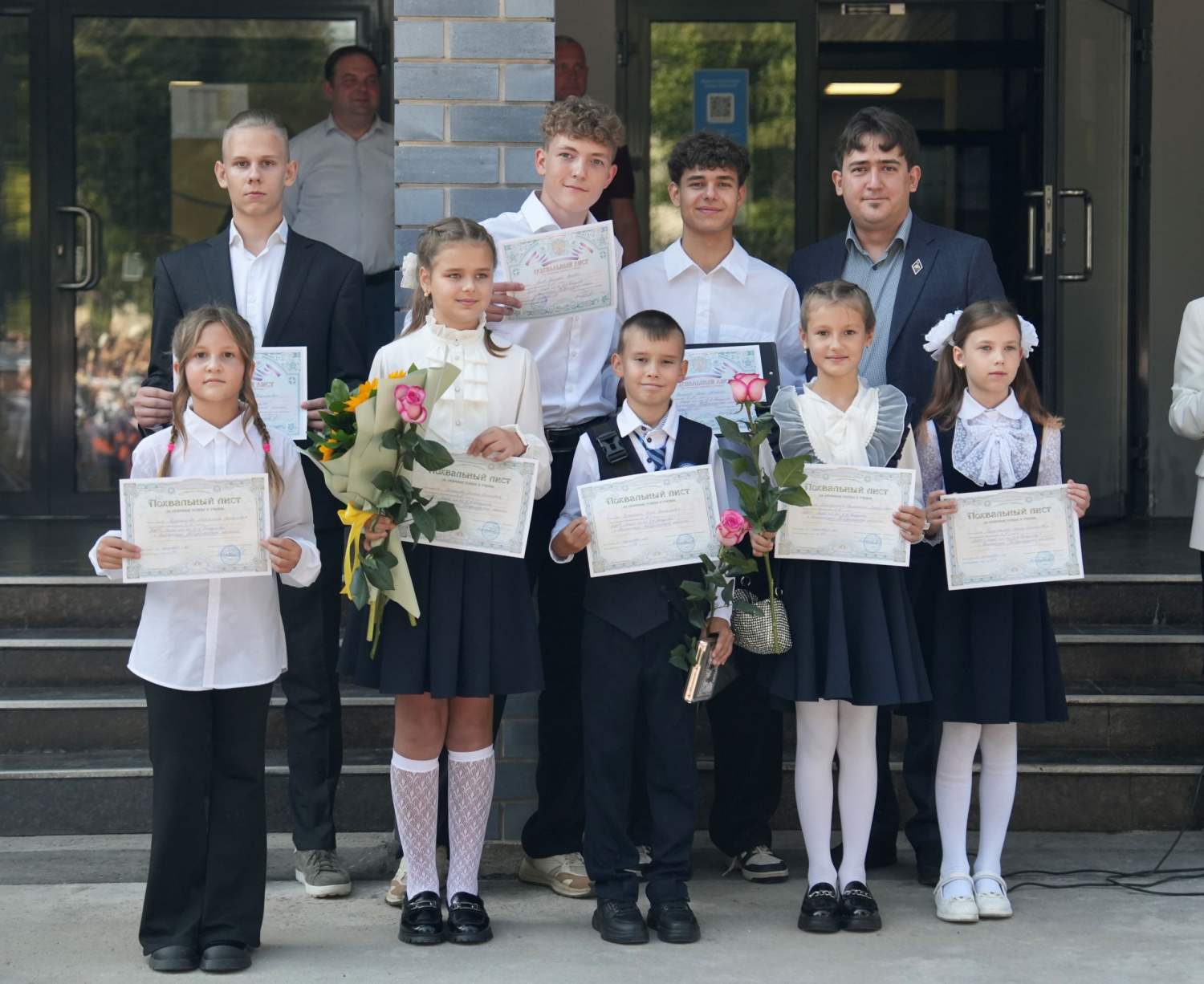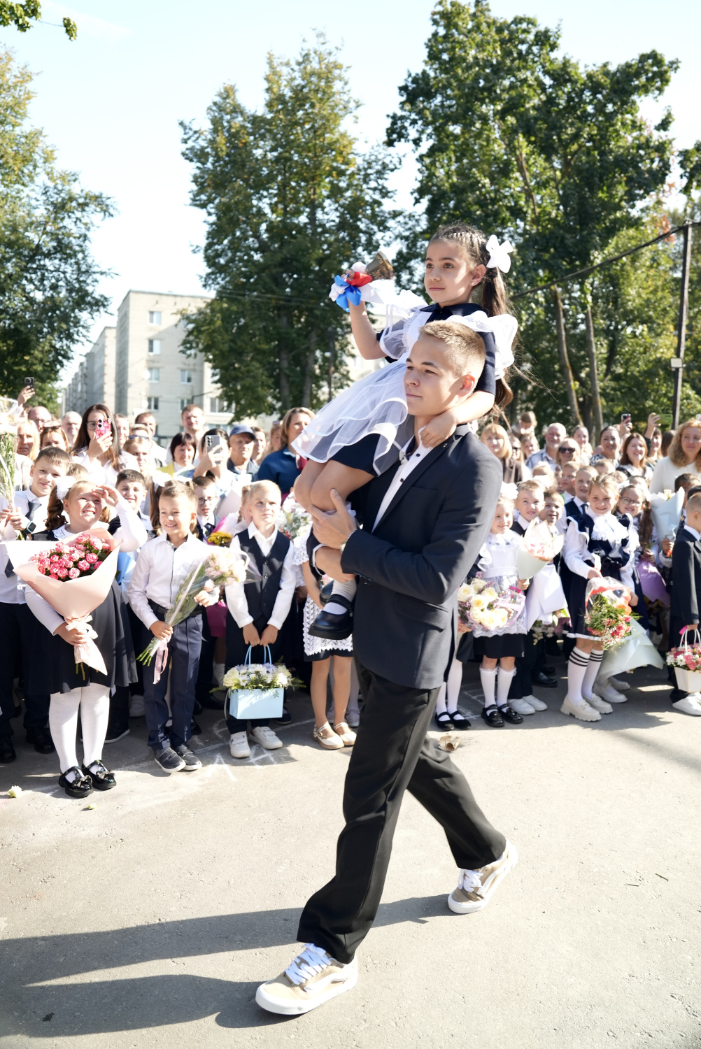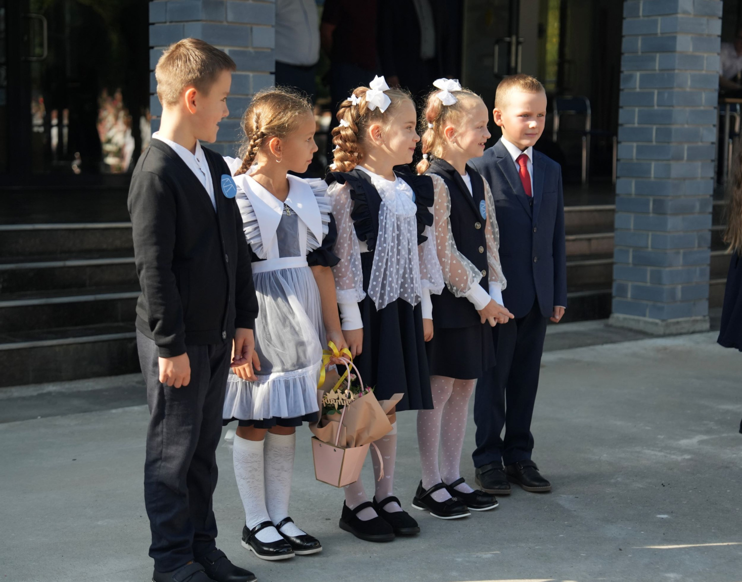 Особое внимание привлекли первые шаги маленьких лицеистов, вступающих в большой мир учебы и дружбы. Ученики пришли в праздничных костюмах и с красивыми букетами цветов, украшая собой просторный двор школы.